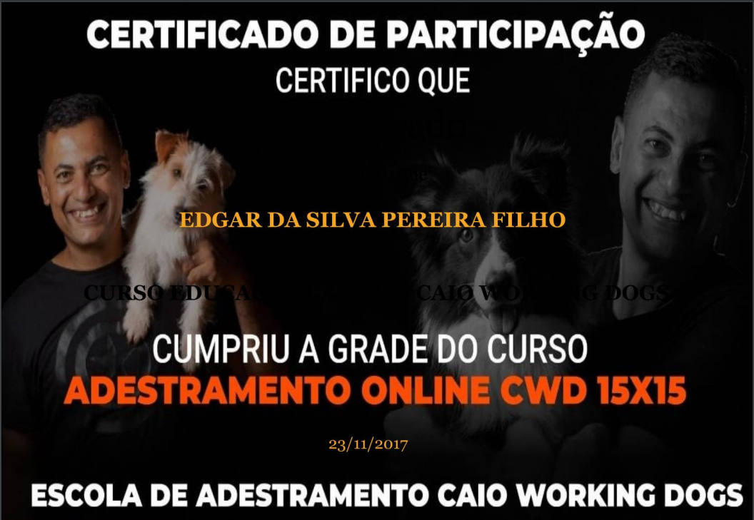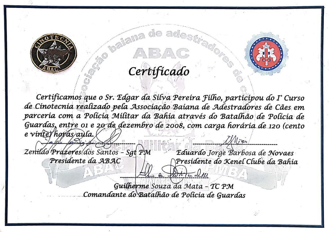Edgar é um adestrador de cães experiente, construiu uma sólida reputação ao longo de sua carreira em Salvador, sendo amplamente respeitado tanto por colegas do ramo quanto por seus clientes, que veem em seu trabalho uma abordagem única e eficaz na educação e comportamento canino.